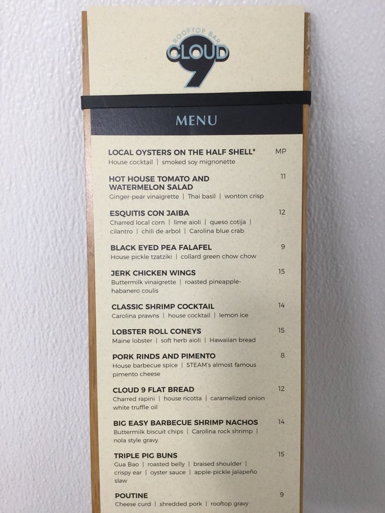 Cloud 9 Rooftop Bar is at Cloud 9 Rooftop Bar. 9 Estell Lee Pl Wilmington NC 28401 910 726-9227 Website. CLOUD 9 ROOFTOP BAR Wilmington - Menu Prices Restaurant.